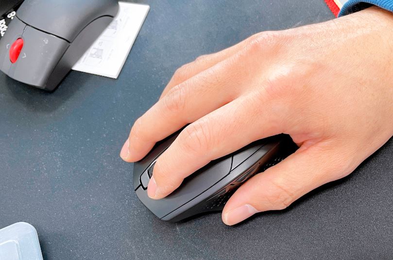 엄지손가락이 닿는 부분의 재질은 다른 부위와 동일하고 삼각형 모양 음각으로 처리하여 마찰력을 높여주었다. 다른 마우스들은 마찰력을 높이기 위해 고무 러버를 사용하는 경우가 있는데 기존에 사용하던 1년 된 마우스는 고무 부분이 떨어져 버렸다. 미끄럼 방지에 도움이 되지만 사용하다 보면 내구성이 떨어질 수밖에 없다. 내구성도 높아지고 마찰력을 위해 조금이라도 신경 쓴 부분이 보인다.