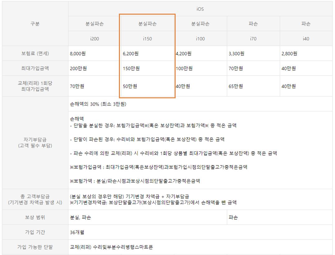i-중고안심_150은 30일이 지나고 보험에 가입하지 못한 고객들을 위한 상품으로 가입은 스마트폰 구입 30일 이후부터 365일까지 가능하다. 보상한도 내에서 자기부담금 30%를 내고 서비스를 받는 비율형 보험이다.