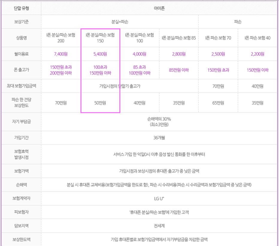 I폰 분실/파손 보험 150은 월 이용료 5,400원으로 2년 가입했을 경우 126,600원이다. LG유플러스 직영점이나 대리점에서 가입할 수 있고 고객센터를 통한 가입은 휴대폰 개통 익일까지 가능하다. 보상한 도내에서 수리비를 지원하며 30%의 자기부담금이 발생한다.